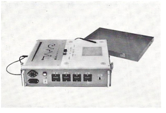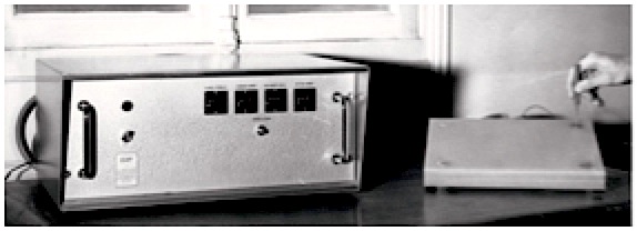 La présentation est changée, les compteurs enregistreurs, sont placés sur un plan incliné, afin d’obtenir une lecture beaucoup plus facile. Contrairement à la présentation réalisée sur cette photo, la plaque qui compose le test et qui supporte les 4 plages métalliques est toujours placée a une distance éloignée du boitier des compteurs, afin de toujours respecter les conditions strictes de l’examen.