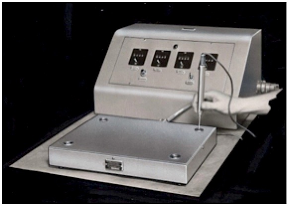 1 – le test de ‘tapping’ de Piéron : épreuve de vitesse motrice simple, où le sujet doit, en un temps imposé, effectuer le plus de touches possibles, avec un stylet, sur la plaque métallique située entre les plages du test ‘Orthokinésimètre’. Chaque touche est enregistrée par un compteur. Le test permet d’apprécier le tempo personnel et la vitesse de frappe du sujet.